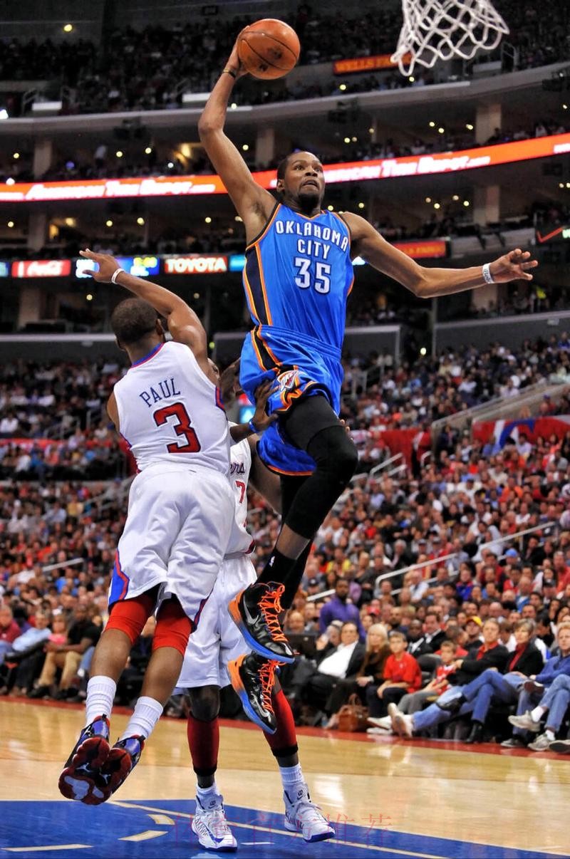 • 杜兰特与蓝喷KD18的双重亮相 当一名顶级球星在全国直播的聚光灯下登场时,人们往往不仅在意他能得到多少分、送出多少次助攻,也会下意识地把镜头与目光,投向他脚下那双球鞋。本场比赛中 杜兰特穿着蓝喷